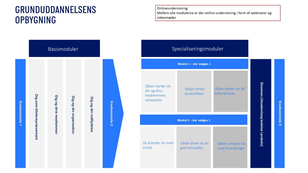 Grunduddannelse er bygget op omkring ét modul i Akademiuddannelsen i ledelse, og pensum er på ca. 340 normalsider.